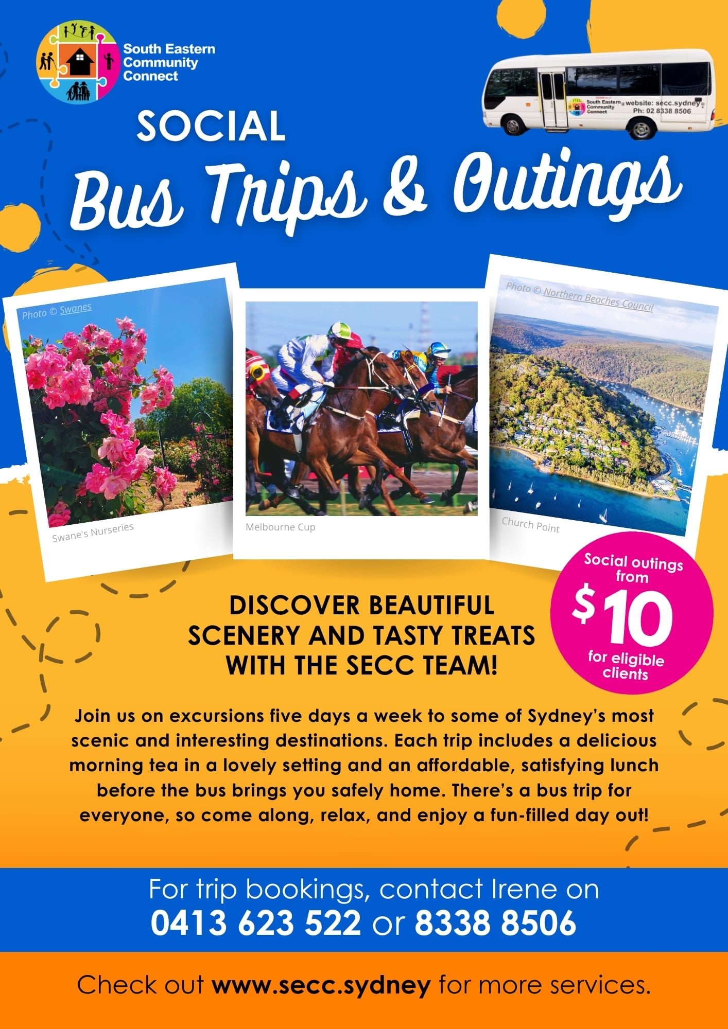 SECC’s community bus trips are crafted to offer enjoyable and affordable day outings for seniors. Destinations include Eastern Suburbs beaches, Wollongong, Taren Point, and local scenic spots—complete with morning tea and lunch in a beautiful setting.
